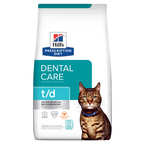 Hill's Prescription Diet t/d Cat Dry Food is clinically proven nutrition to reduce plaque, stain & tartar buildup and clean up to the gum line. It is formulated as a complete and balanced nutritional solution for your cat's daily health regimen. Exclusive feeding of Hill's Prescription Diet t/d Cat Dry Food has been shown to be more effective than toothbrushing.