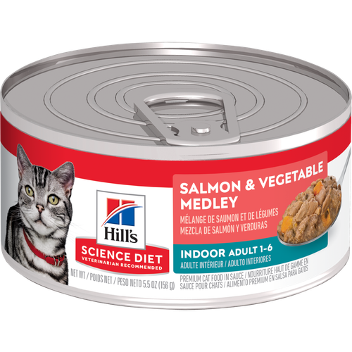 Precisely balanced nutrition for indoor cats with the delicious taste of savory salmon and vegetables